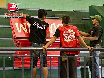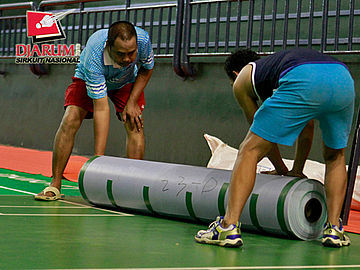 Para pekerja sedang mempersiapkan karpet lapangan di Hall Bulutangkis Asia Afrika.