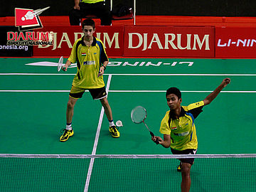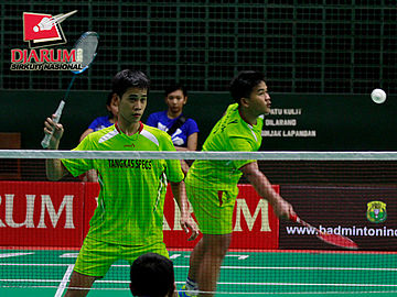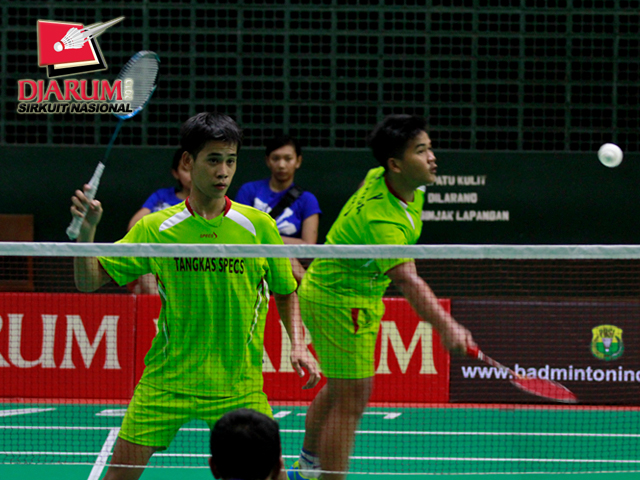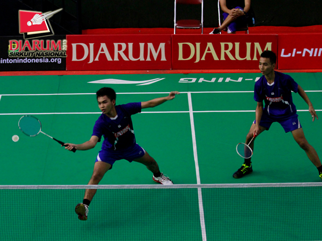 Ade Kurniawan/Vicky Al Denis (Mutiara Bandung) berusaha membalikan kok ke arah Ikal Tahta Yuandri/Willian astan (Exist Jakarta).