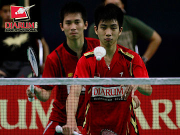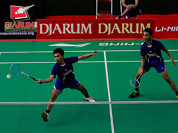 Andre Pinastika Rosadi/Henry jansen Putra Wibowo (Djarum Kudus) malakukan serve.