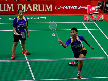 Pasangan ganda Satria Agum/Zayena R berusaha mengejar kok.