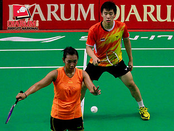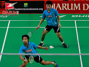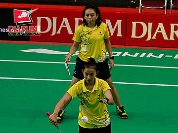 Trikusharjanto/ Vita Marisa (Pertamina Indonesia/Djarum Kudus) menyambar serve Marcus Fernaldi Gideon/Endang Nursugianti (Tangkas Specs).