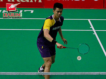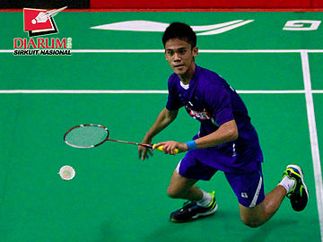 Firman A kholiq (Mutiara Bandung) mencoba mengembalikan kok ke arah Alvindo Saputra (Tangkas Specs).