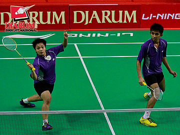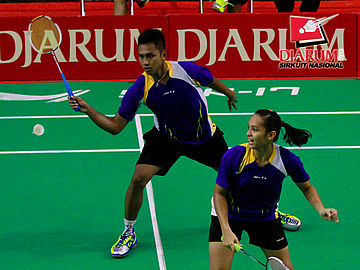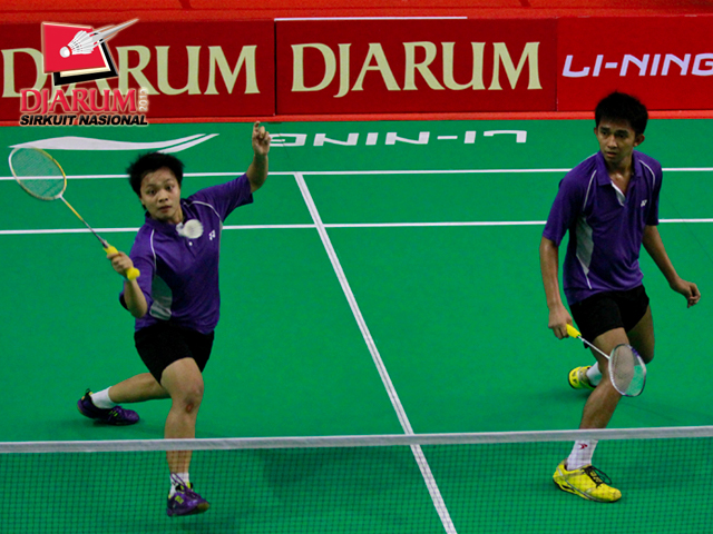 Fauzi Habibi/Apriani Rahayu (Pelatprov PBSI DKI Jakarta) menyambar pengembalian Yantoni Edy Saputra/Marsheilla Gischa (Djarum Kudus/Dasa Digdaya).