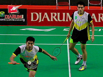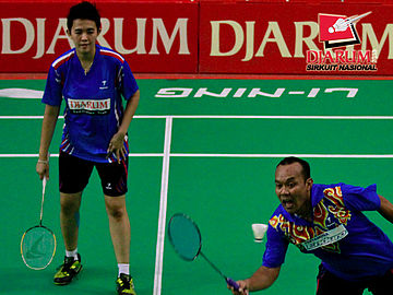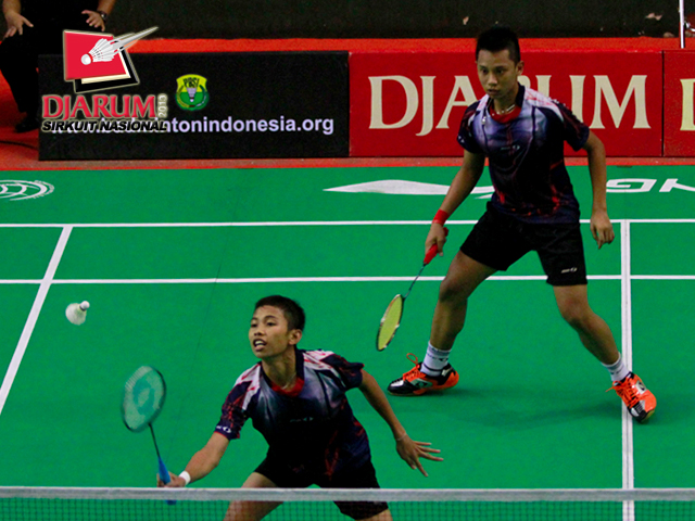 Danang Dwi S/Ridho Islami (jaya Raya Jakarta) mengembalikan kok ke arah Raynaldi/Wisnu Cahyo Saputro Exist Jakarta).