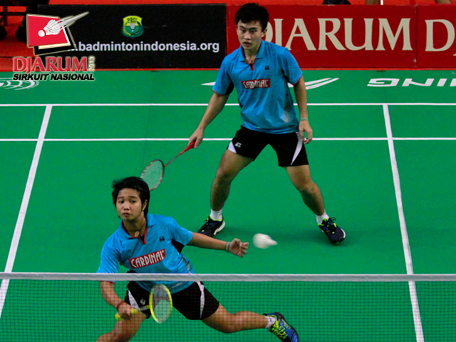 Rian Swastedian/Masita Mahmudin (Jaya Raya Jakarta) mengembalikan kok ke arah Reinard Dhanriano/Sinta Arum (Mutiara Bandung).