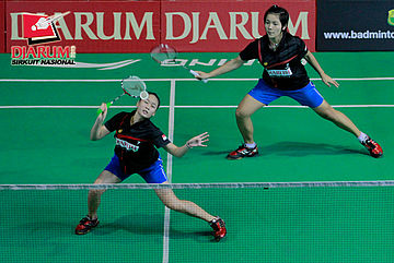 Cynthia Shara/Rahmadhani Hastiyanti (PB Djarum) berhasil menghadang serangan yang dilepaskan Dianita Saraswati/Yulfira Barkah (Mutiara Bandung).