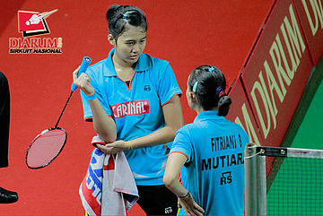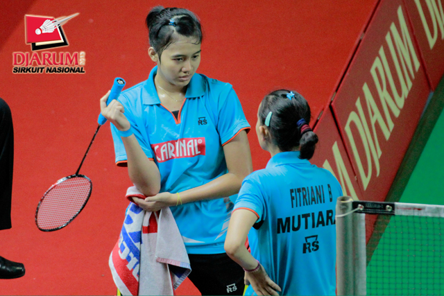 Bunga Fitriani/Mayrina Lukmanda (Mutiara Bandung) saling berkoordinasi saat jeda set pertama.