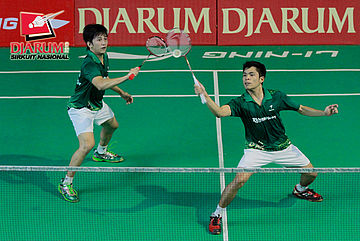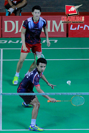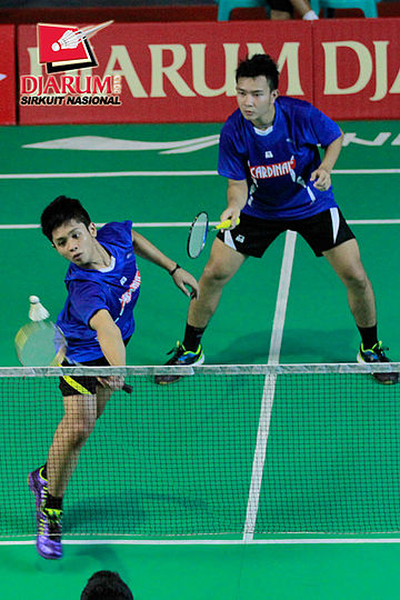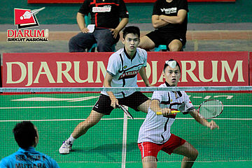 Andika Ramadiansyah/M. Febriansyah (PB Djarum) menyambar pengembalian dari Adittya Dwiantoro/Kevin Ezra (Exist).