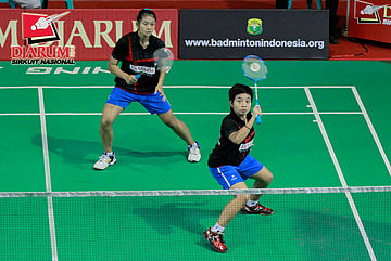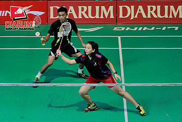 Aji Firmansyah/Bunga Fitriani (Mutiara Bandung) bersiap mengembalikan shuttlecock ke arah Andika Ramadiansyah/Marsheilla Gischa (PB Djarum).