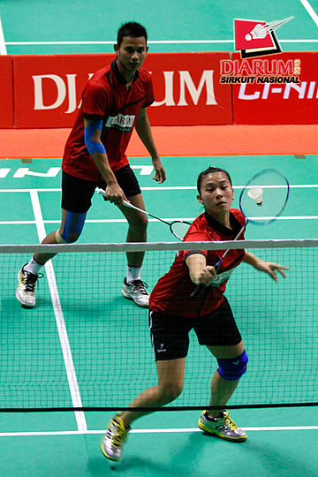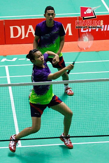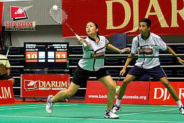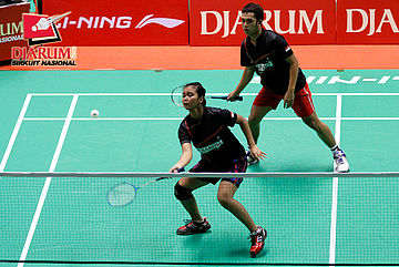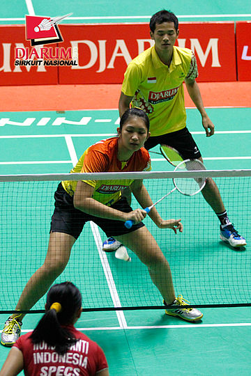 Darmiko/Deariska Putri (PB Djarum) bersiap mengembalikan shuttlecock ke arah Dwi Setiawan/Endang Nursugianti (Tsunami/Tangkas Specs).