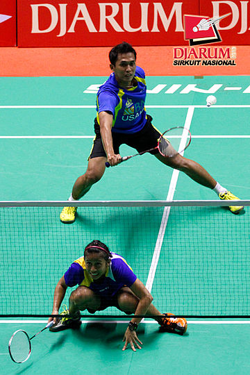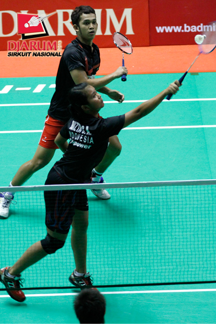 Didit Juang/Nurbeta Kwanrico (PB Djarum) menyambar pengembalian tanggung dari Renaldi/Fauziah Lahia (Hi Qua Wima).