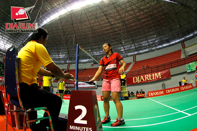 Tutut Rosita (PB Djarum) meminta pergantian shuttlecock.