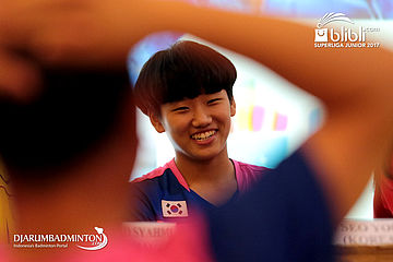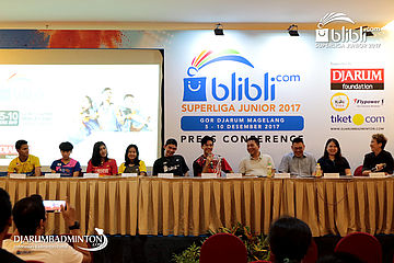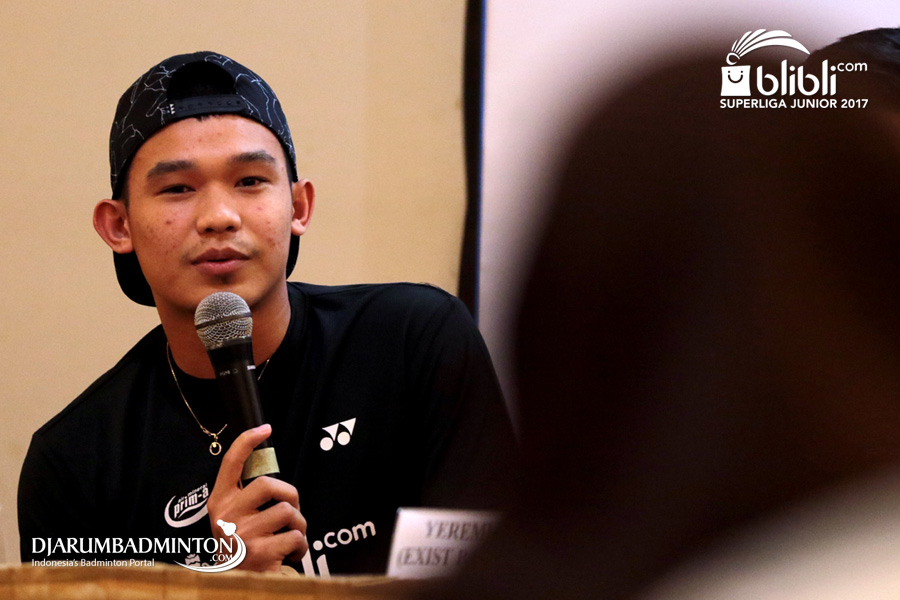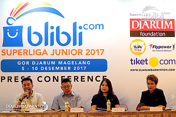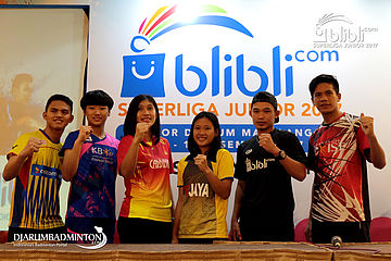 Dari Kiri Ke Kanan: Muhammad Syahmi (Malaysia), An Seo Young (Korea), Choirunnisa (PB Mutiara Cardinal), P.H Mentari (PB Jaya Raya), Yeremia Erich (PB Bxist) Dan Rinov Rivaldy (PB Djarum) Berpose Ala Korea Usai Press Conference Blibli.com Superliga Junior