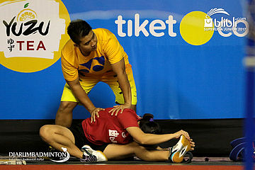 Ribka Sugiarto (Djarum) Melakukan Peregangan Dibantu Fisioterapis Sebelum Bertanding