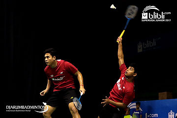 Helmi Yudha Arrafi/Peter Mandala Surya Sumardi (Mutiara Cardinal) Mengembalikan Shuttlecock