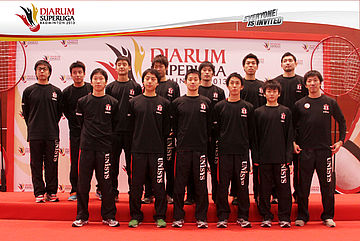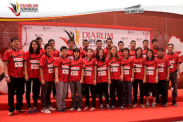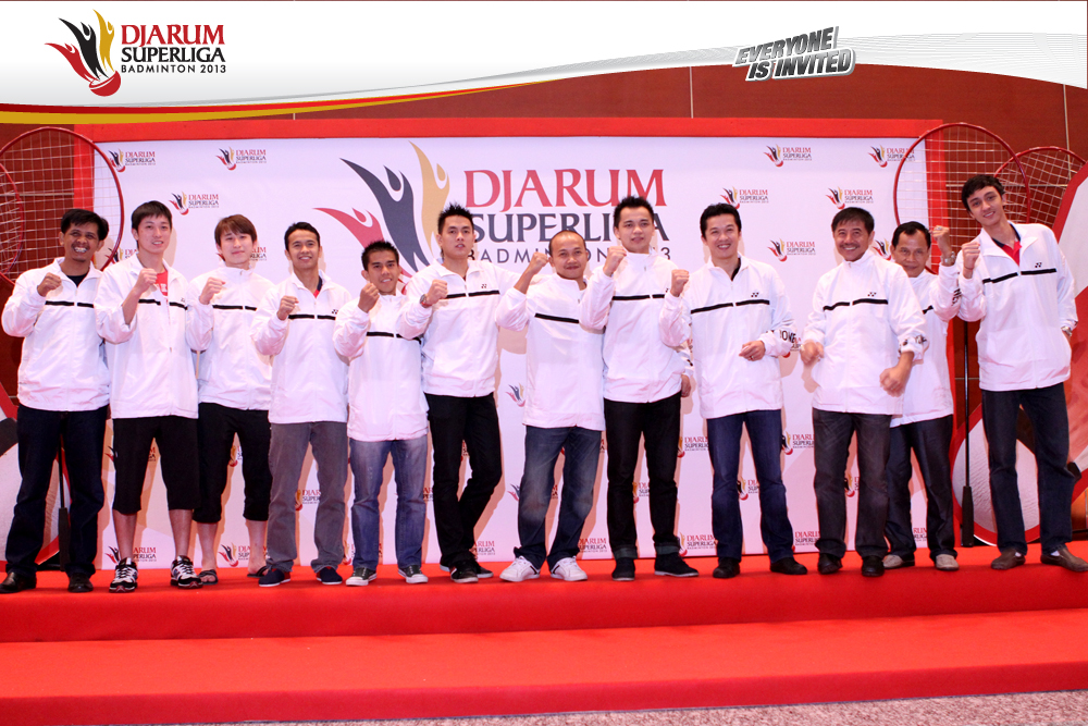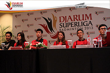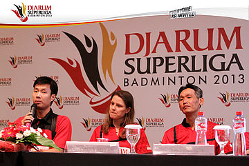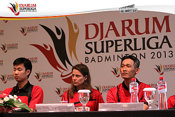 Boonsak Ponsana dari Jaya Raya (kiri), Juliane Schenk asal PB Djarum (tengah) dan Manajer PB Djarum, Fung Permadi (kanan) saat menyimak pertanyaan dari wartawan.