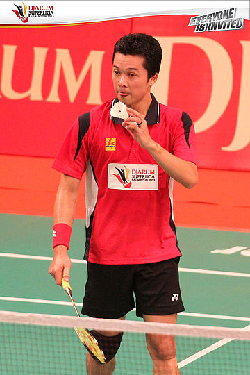 Taufik Hidayat berusaha mengembalikan kok ke arah pemain Tonami Badminton, Riichi Takeshita.