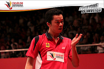 Taufik Hidayat membersihkan keringat ketika berlaga melawan pemain Tonami Badminton, Riichi Takeshita. 20.