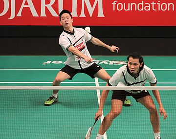 Ahsan dan Berry bersiap menghadang shuttle cock lawan