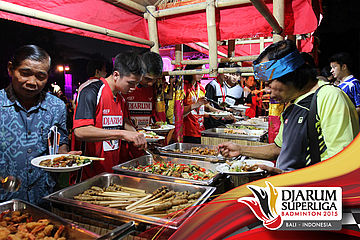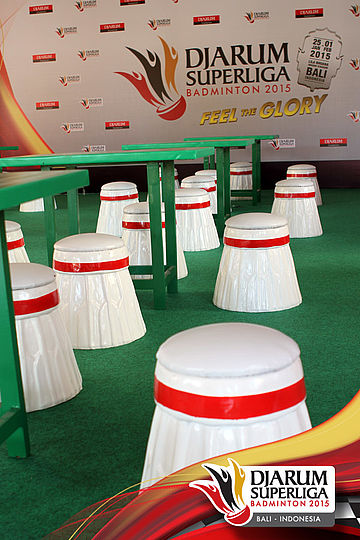 Dekorasi food court Djarum Superliga 2015 yang dihias menyerupai shuttlecock dan lapanan bulutangkis.