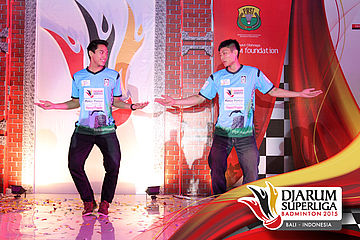 Jonathan Christie (kiri) dan Chou Tien Chen (kanan) dari Musica Champion Kudus saat menari di atas panggung Gala Dinner Djarum Superliga 2015.
