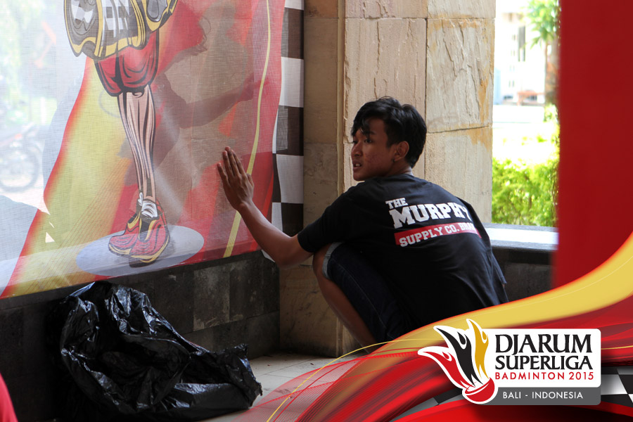 Seorang pekerja hendak memasang dekorasi Djarum Superliga 2015.