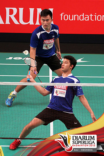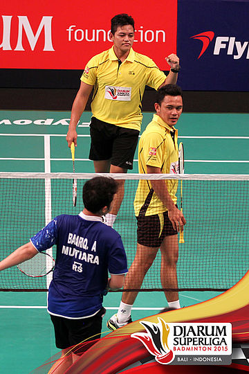 Panji Ahmad (Mutiara Cardinal) mengembalikan shuttlecock ke arah Febriyan Irvalandi (Hi Qua Wima).