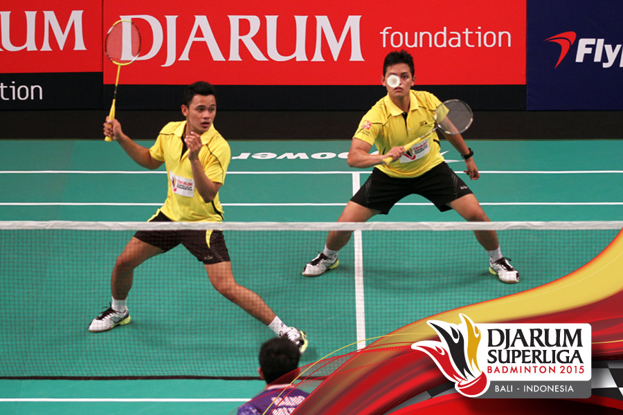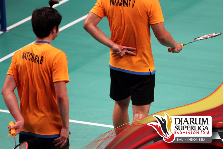 Pakkawat Vilailak/Watchara Buranakuea (Granular Thailand) memberikan isyarat saat berhadapan dengan Kazuaki Oshima/Yuki Umino (Hitachi Jepang).