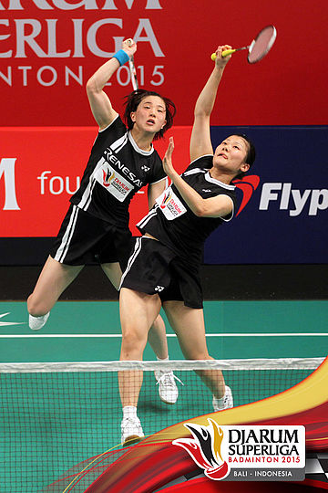 Miyuki Maeda/Reika Kakiiwa (Renesas Jepang) berusaha menggapai pengembalian dari Apriyani Rahayu/Jauza Fadhila (Jaya Raya New Star).