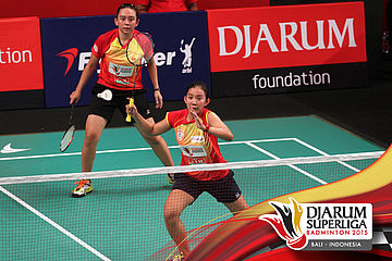 Miyuki Maeda/Reika Kakiiwa (Renesas Jepang) mengembalikan shuttlecock ke arah Apriyani Rahayu/Jauza Fadhila (Jaya Raya New Star).
