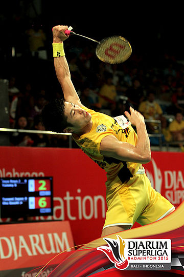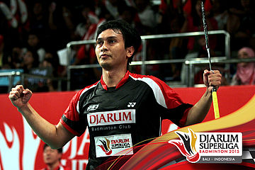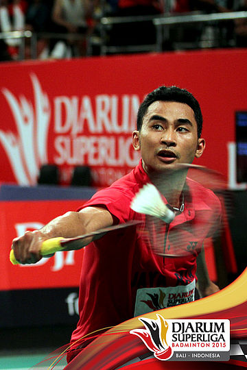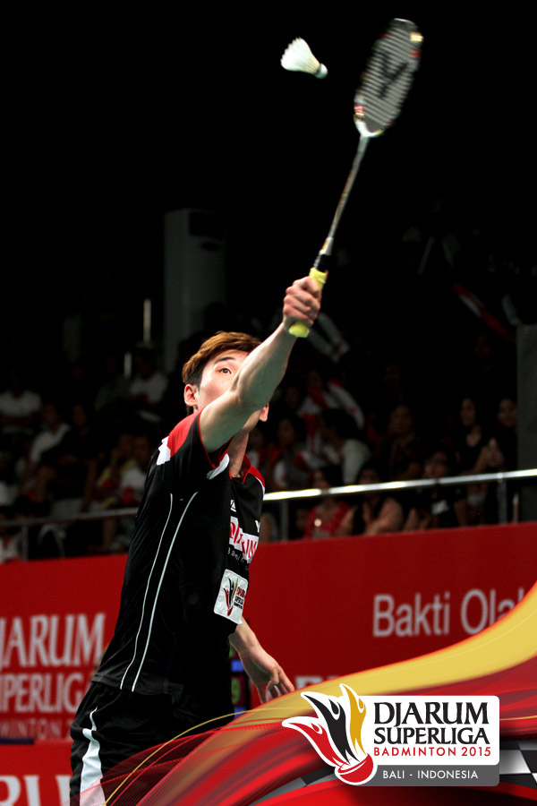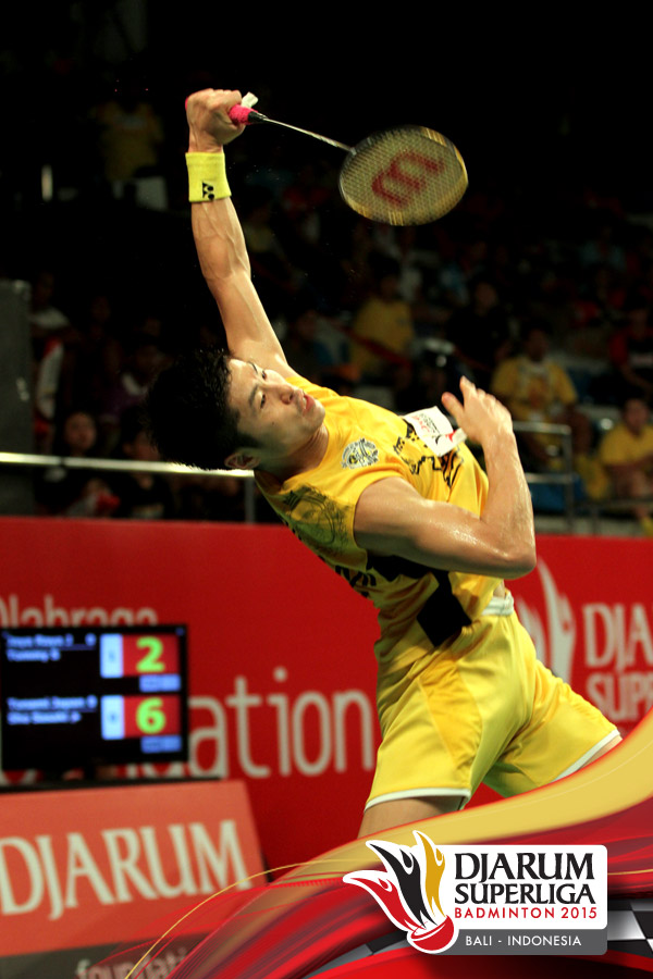 Tommy Sugiarto (Jaya Raya) mengembalikan shuttlecock ke arah Sho Sasaki (Tonami Jepang).