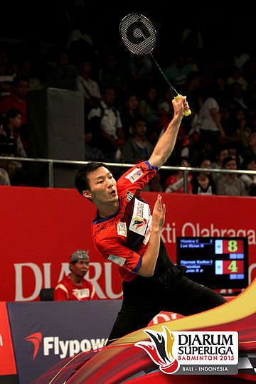 Lee Hyun Il (Musica Champion) melepaskan smash ke arah Dionysius Hayom Rumbaka (Djarum Kudus).