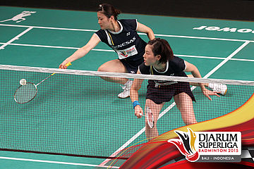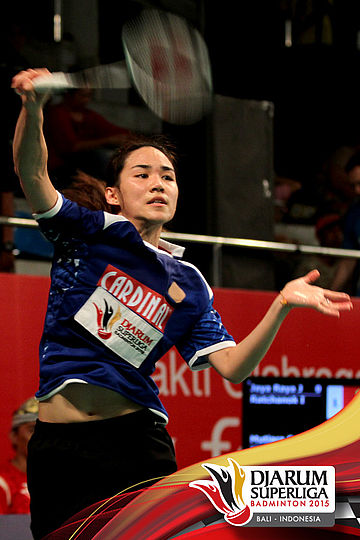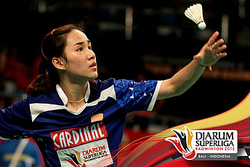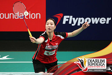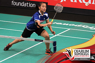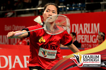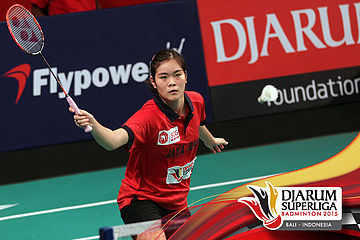 Sung Ji Hyun (Djarum Kudus) bersiap menyambar pengembalian tanggung dari Kana Ito (Renesas Jepang).