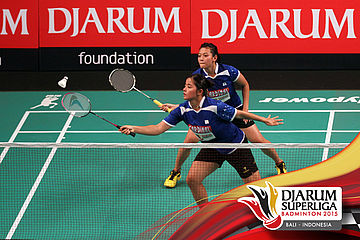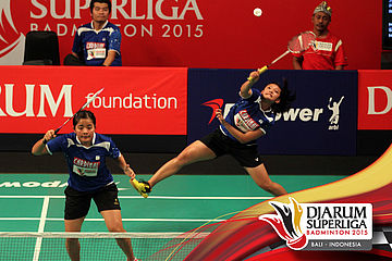Maretha Dea/Suci Rizky (Mutiara Cardinal) mengembalikan shuttlecock ke arah Pia Zebadiah/Rizki Amelia (Jaya Raya).