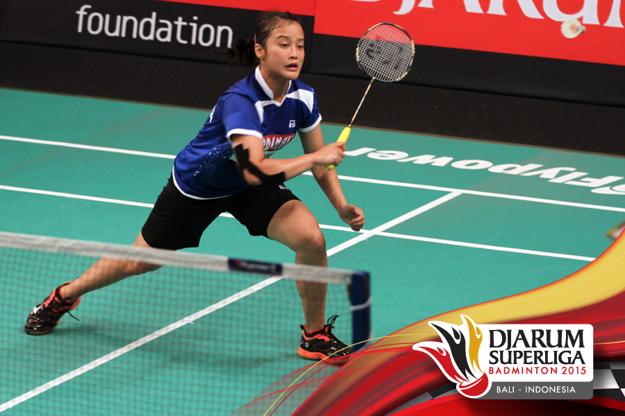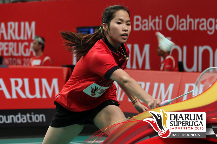 Ratchanok Intanon (Jaya Raya) berhasil menghadang serangan yang dilepaskan Nichaon Jindapon (Mutiara Cardinal).