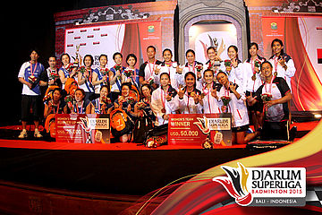 Juara putri Djarum Superliga 2015, Jaya Raya (kanan) dan runner up putri Djarum Superliga 2015, Renesas Jepang berfoto bersama.