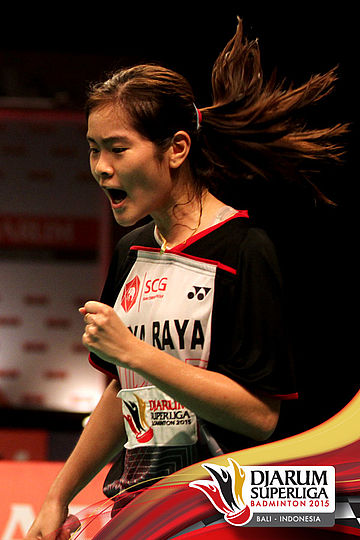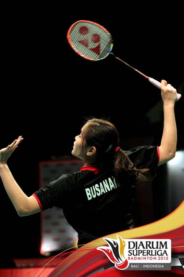 Busanan Ongbumrungpan (Jaya Raya) saat melemparkan merchandise Djarum Superliga 2015 ke arah penonton.