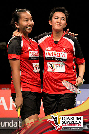 Rosyita Eka/Vita Marissa (Djarum Kudus) saling berpelukan setelah berhasil memenangkan pertandingan melawan Nagahara Wakana/Matsumoto Mayu (Hokuto Bank Jepang).