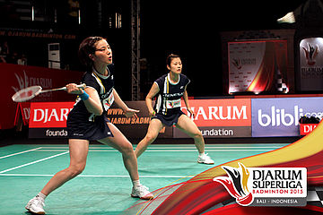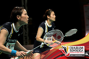 Miyuki Maeda/Reika Kakiiwa (Renesas Jepang) bersiap menyambut pengembalian dari Pia Zebadiah/Rizki Amelia (Jaya Raya).