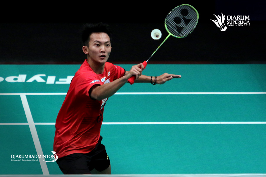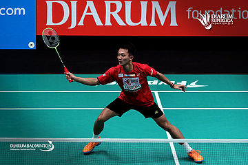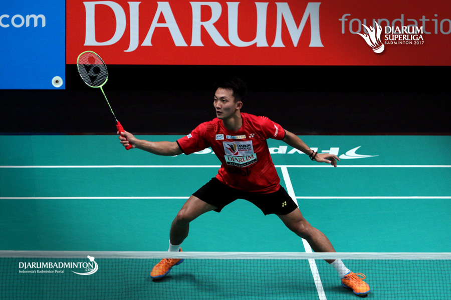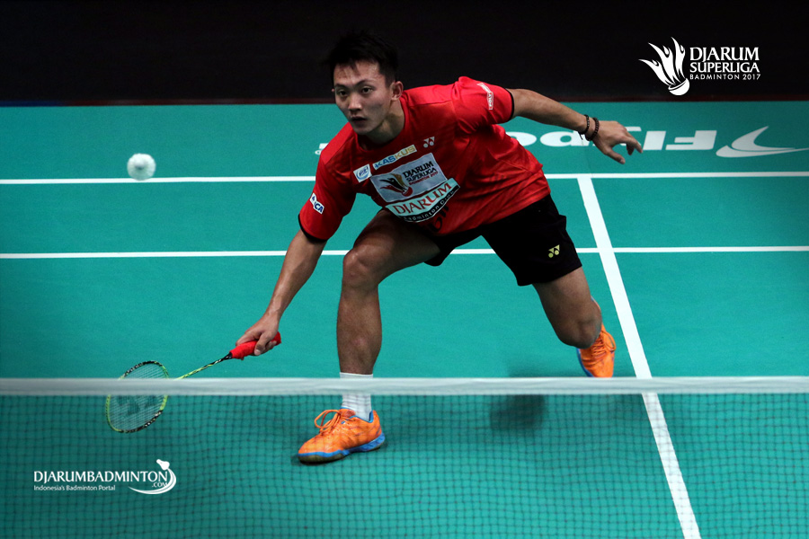 Ihsan Maulana (PB Djarum) mengembalikan shuttlecock.