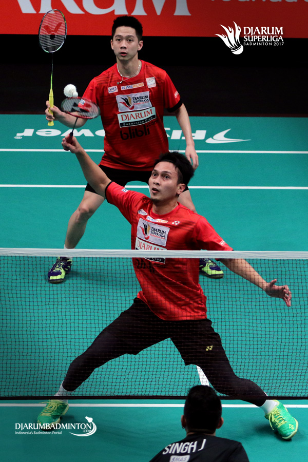 Mohammad Ahsan/Kevin Sanjaya (PB Djarum) bersiap menyambar pengembalian.