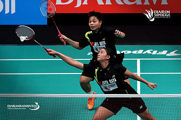 Apriyani Rahayu/Jauza Fadhila (Jaya Raya) bersiap menghadang serangan.