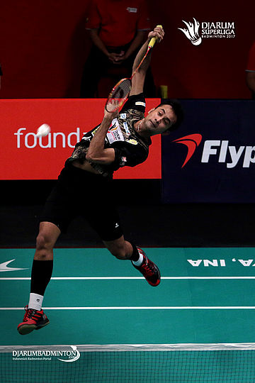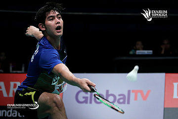 Dionysius Hayom Rumbaka (USM Blibli.com) melepaskan serangan.