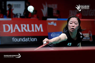 Ayumi Mine (Kumamoto Saishukan) mengembalikan shuttlecock.
