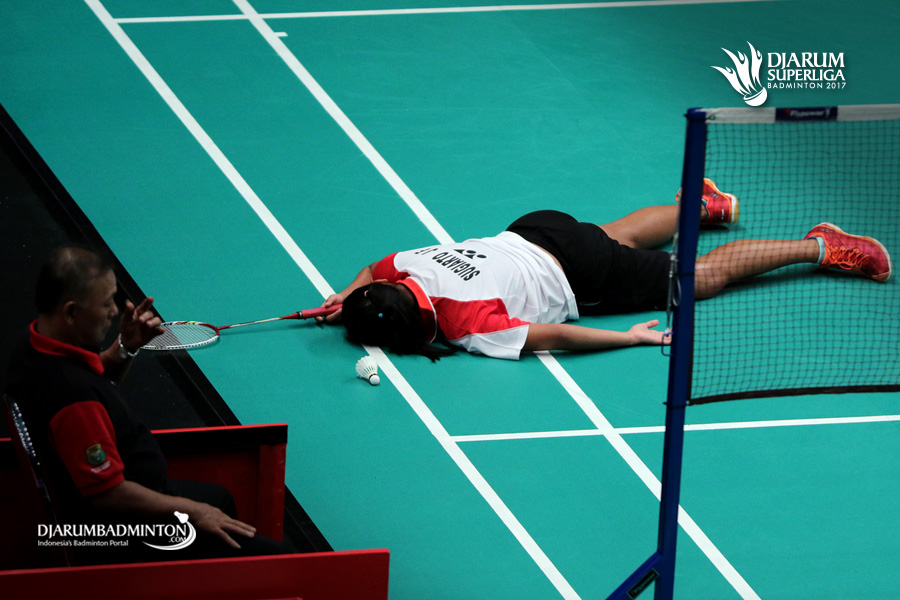 Jauza Fadhila (PB Jaya Raya) terjatuh saat berusaha menghadang serangan.