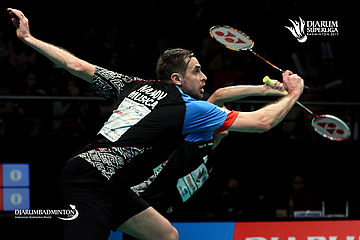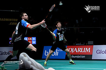 Lee Yong Dae/Vladimir Ivanov (PB Musica Champion) menghadang serangan.