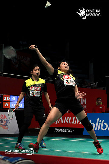 Maretha Dea Giovani/Suci Rizki Andini (PB Mutiara Cardinal) bersiap menyambar pengembalian.