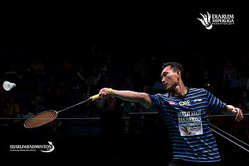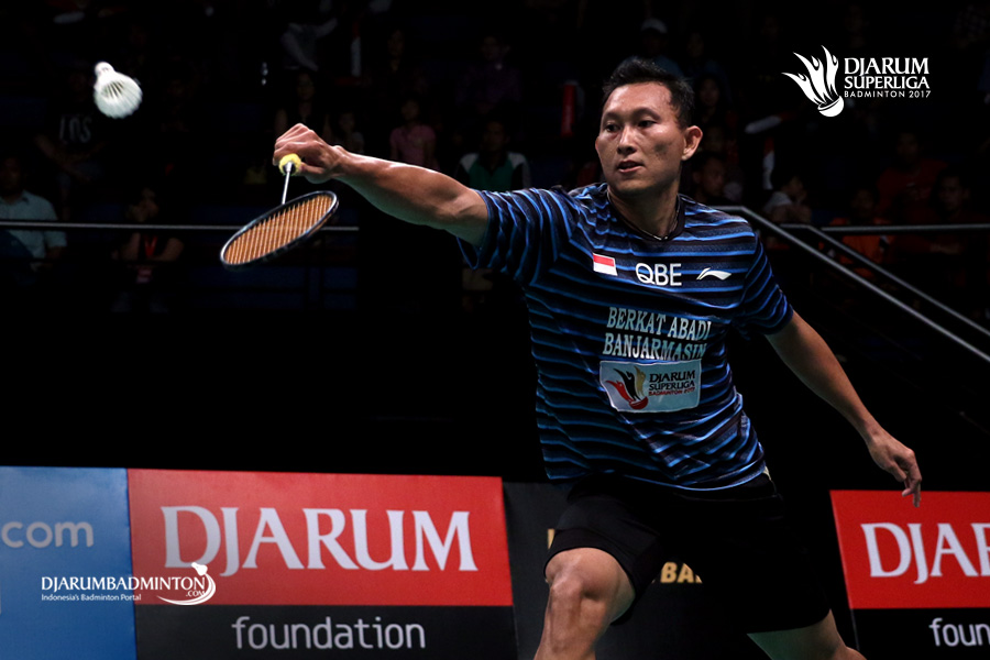 Sony Dwi Kuncoro (PB Berkat Abadi) mengembalikan shuttlecock.