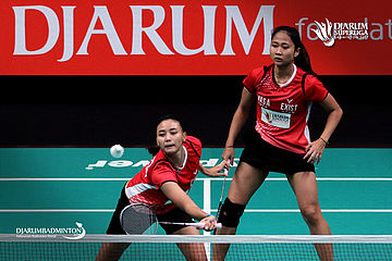 Meirisa Cindy/Ni Ketut Mahadewi (PB Tjakrindo Masters) bersiap melepaskan serangan.