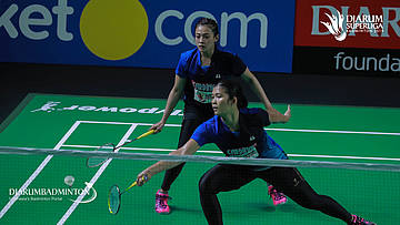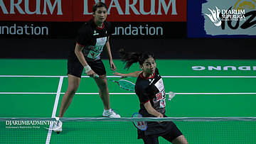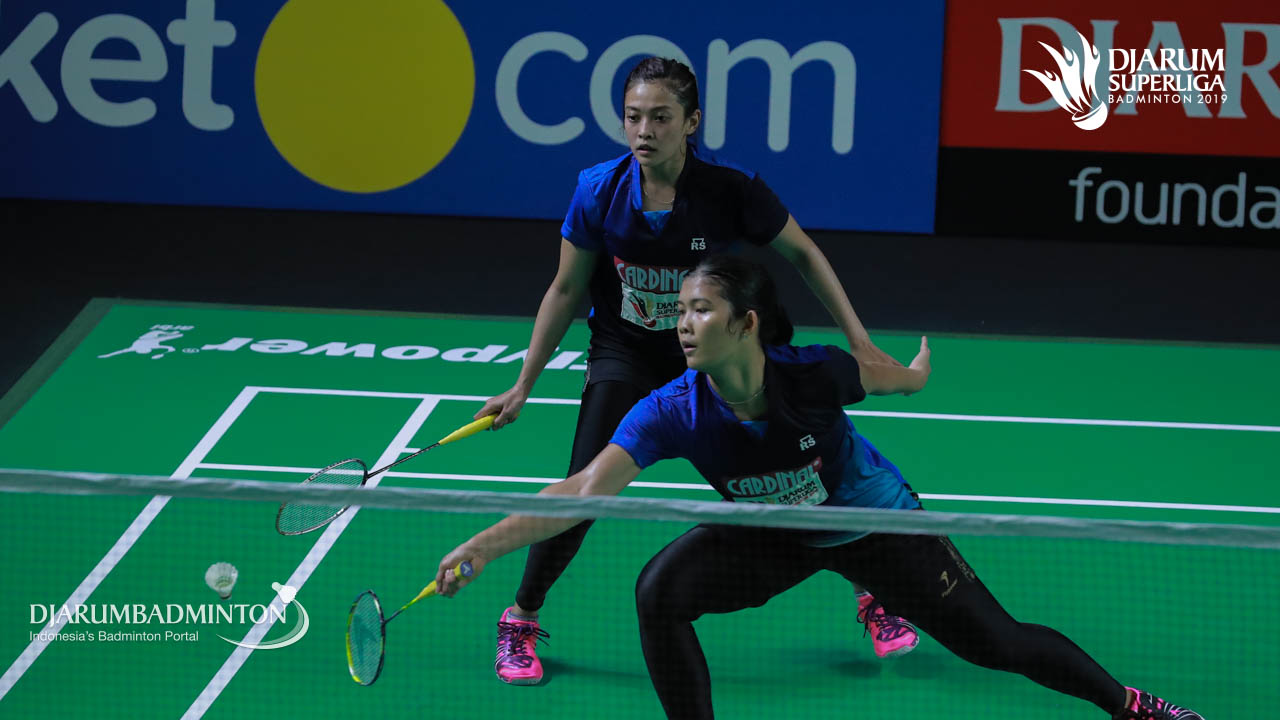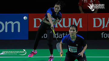 Maretha Dea Giovani/Yulfira Barkah (Mutiara Cardinal Bandung) mengembalikan shuttlecock
